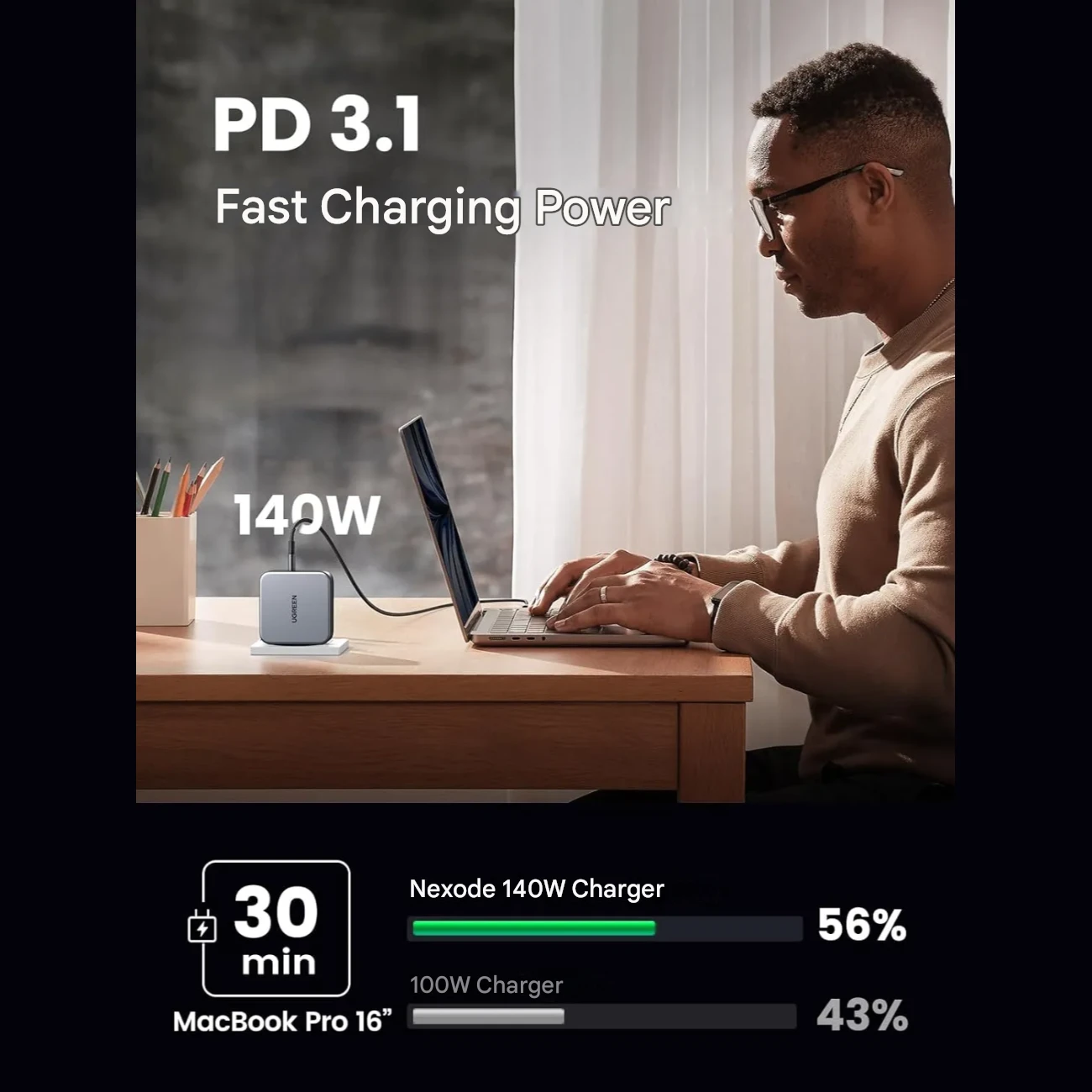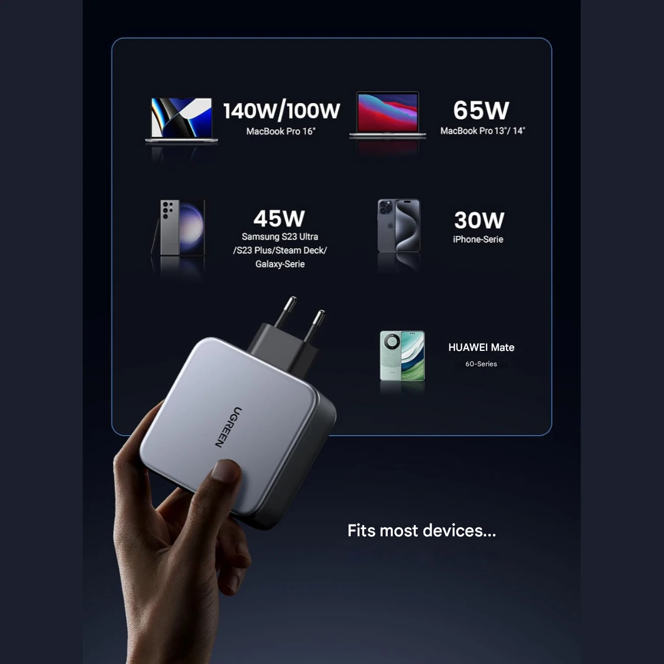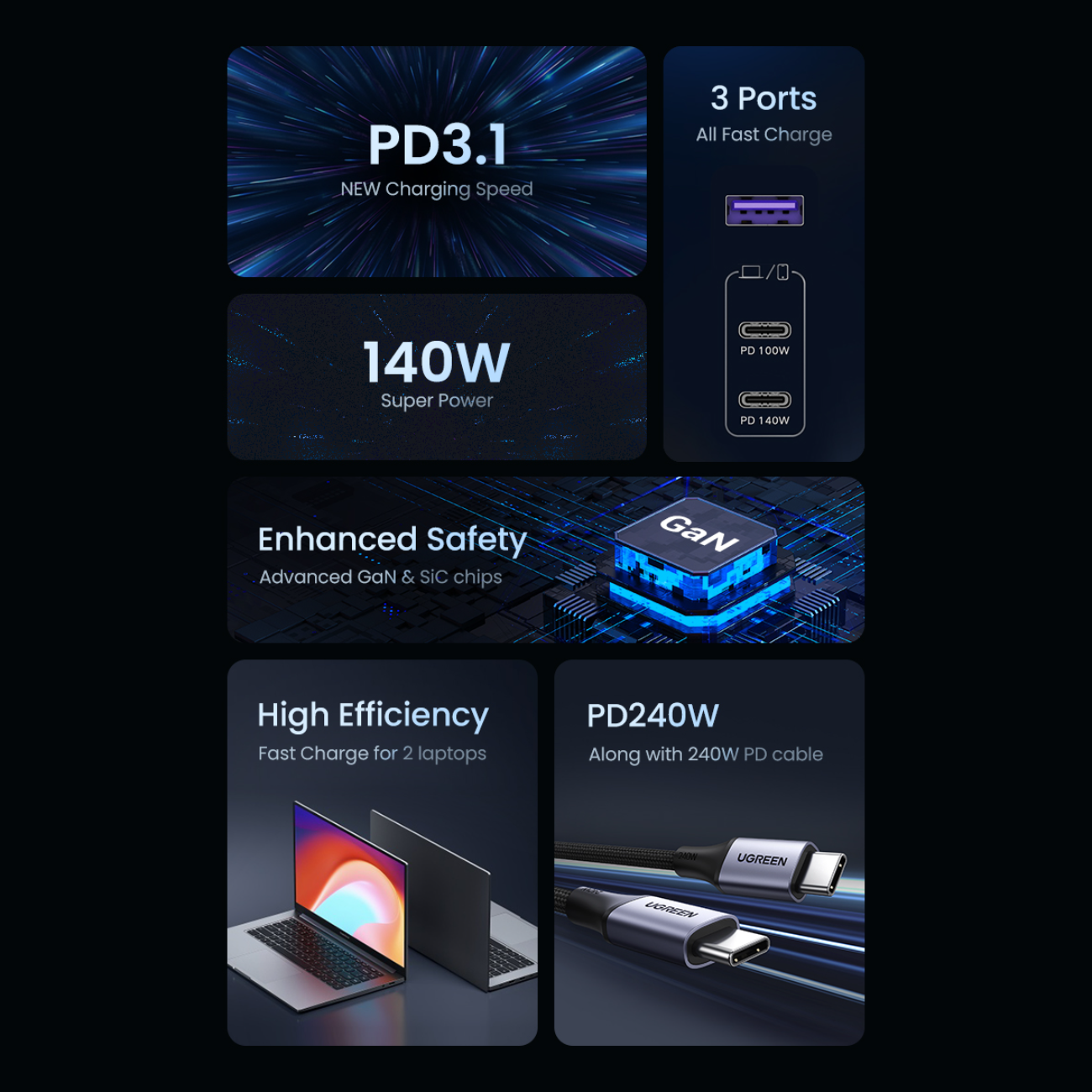 | سایر ویژگیها | - مجهز به فناوری GaN - شارژ سریع 140 وات لپتاپ - شارژ مکبوک پرو 16 اینچی به 56% در 30 دقیقه، آیفون 13 به 60% در 30 دقیقه |