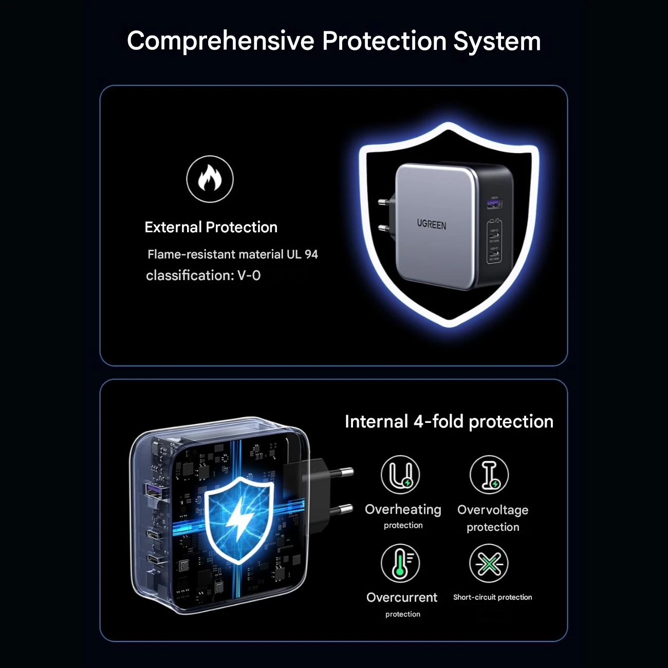 | ویژگیهای ایمنی | فناوری Thermal Guard (بیش از 5 خوانش دما در ثانیه)، سیستم Power Dispenser، مقاوم در برابر اضافهبار، اتصال کوتاه، نوسانات ولتاژ، و آتشسوزی (Fireproof) |