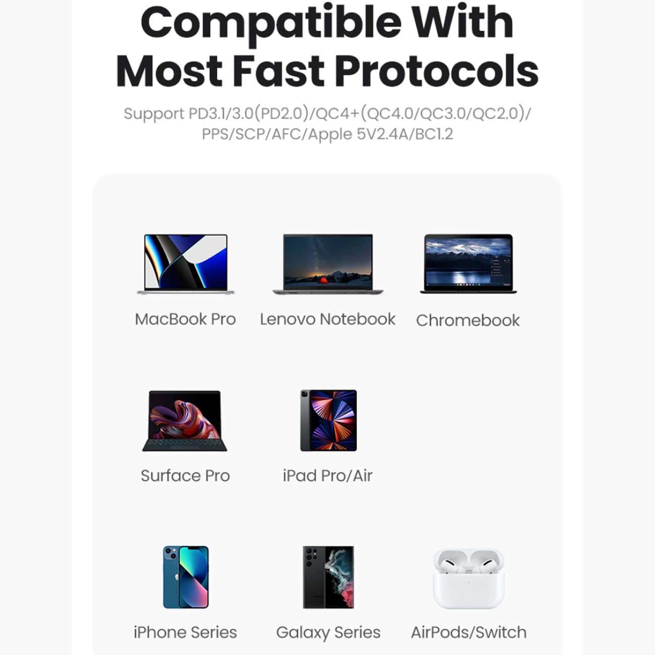 | سازگاری | مکبوک پرو/ایر، دل XPS، اچپی Spectre، آیپد پرو/ایر، سرفیس پرو، سری آیفون، سری گلکسی، پیکسل، نینتندو سوییچ و غیره |