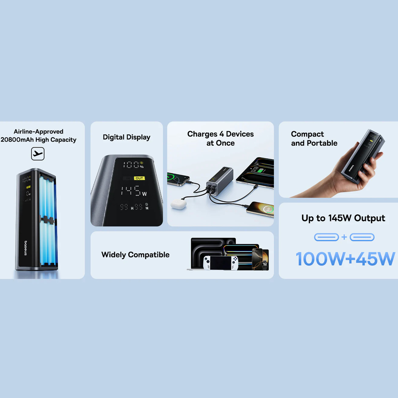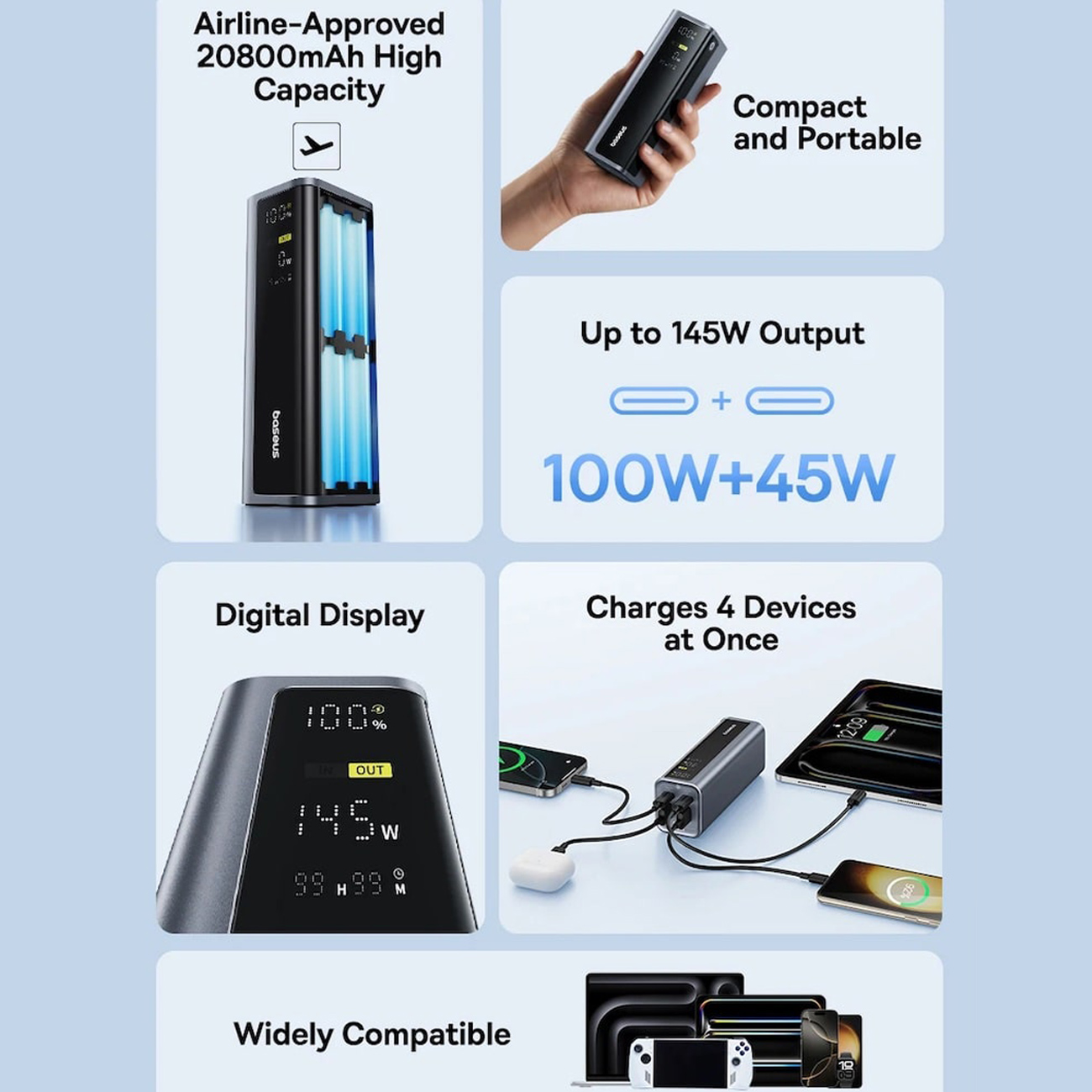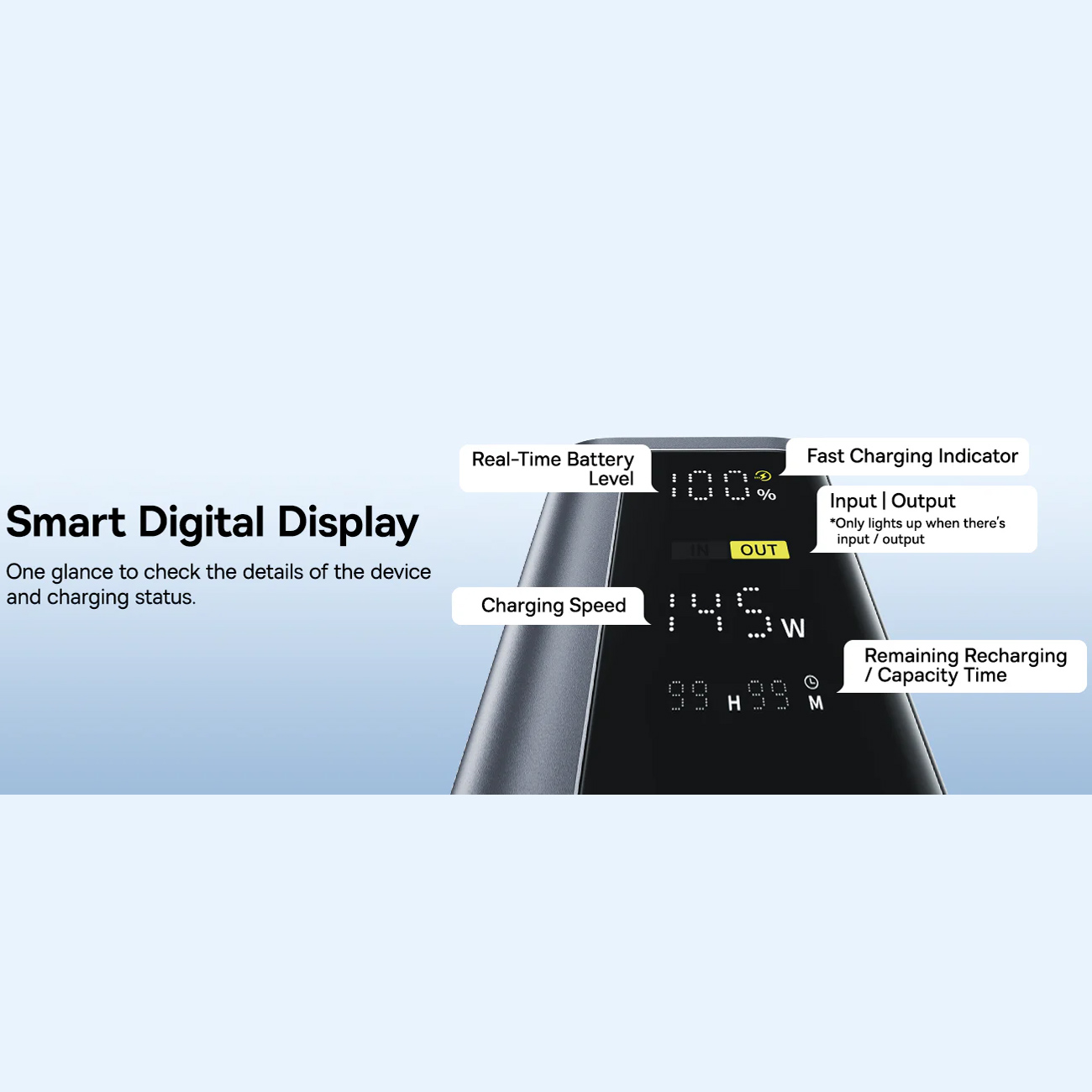 امکانات و قابلیتها | شارژ همزمان 4 دستگاه، نمایشگر دیجیتال هوشمند، حفاظتهای 9گانه ایمنی، کابل 100W همراه، TSA-approved |