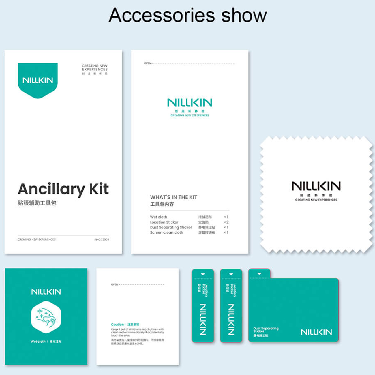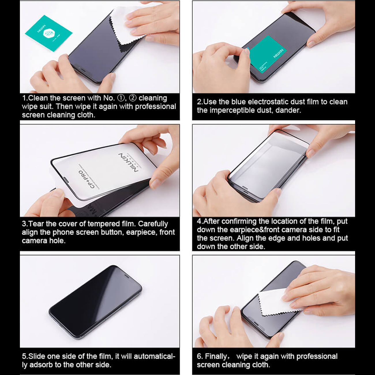 محتویات بسته | 1 عدد گلس CP+ Pro، 1 عدد دستمال تمیزکننده، 1 عدد برچسب ضد الکتریسیته ساکن، 1 عدد دستمال خشک، 1 عدد کارت نصب |