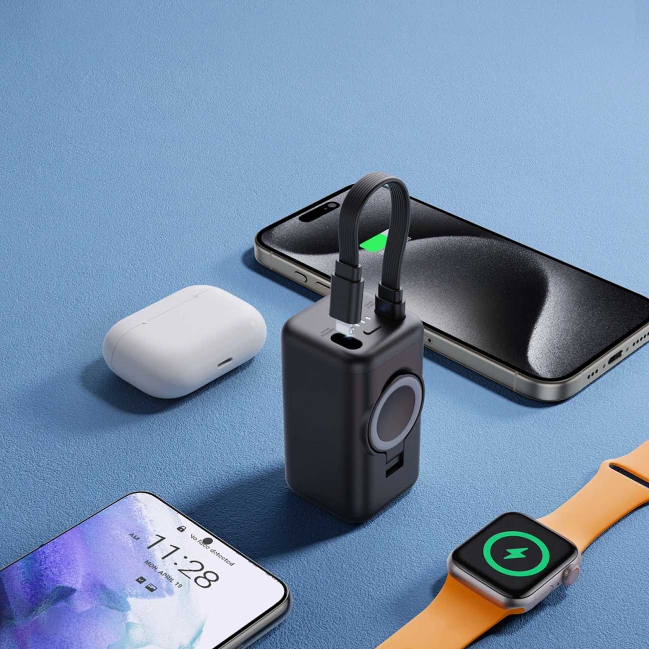 | سازگار با | اپل واچ (Apple Watch): تمامی مدلها با شارژ بیسیم 3 وات گوشیهای آیفون (iPhone): مدلهای دارای درگاه Lightning و پشتیبانی PD 3.0 گوشیهای اندرویدی (Android): مدلهای دارای پورت USB-C و پشتیبانی شارژ سریع ایرپاد و هدفونهای بیسیم: دستگاههای دارای درگاه Lightning یا USB-C سایر گجتهای پوشیدنی و دیجیتال: پشتیبانی از شارژ بیسیم و کابل Type-C / Lightning |