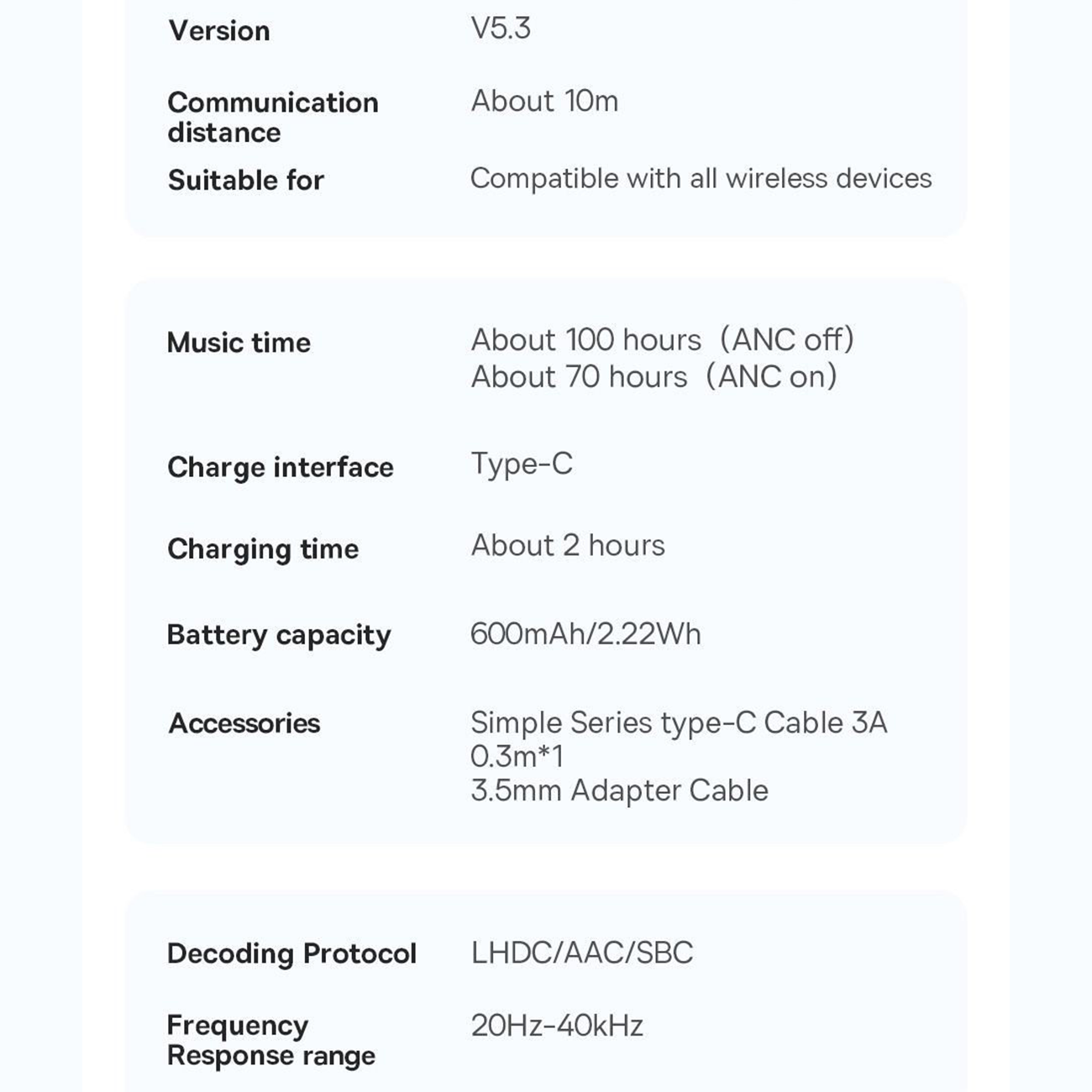 مدت زمان شارژدهی | حدود 100 ساعت (ANC خاموش) / 70 ساعت (ANC روشن) |