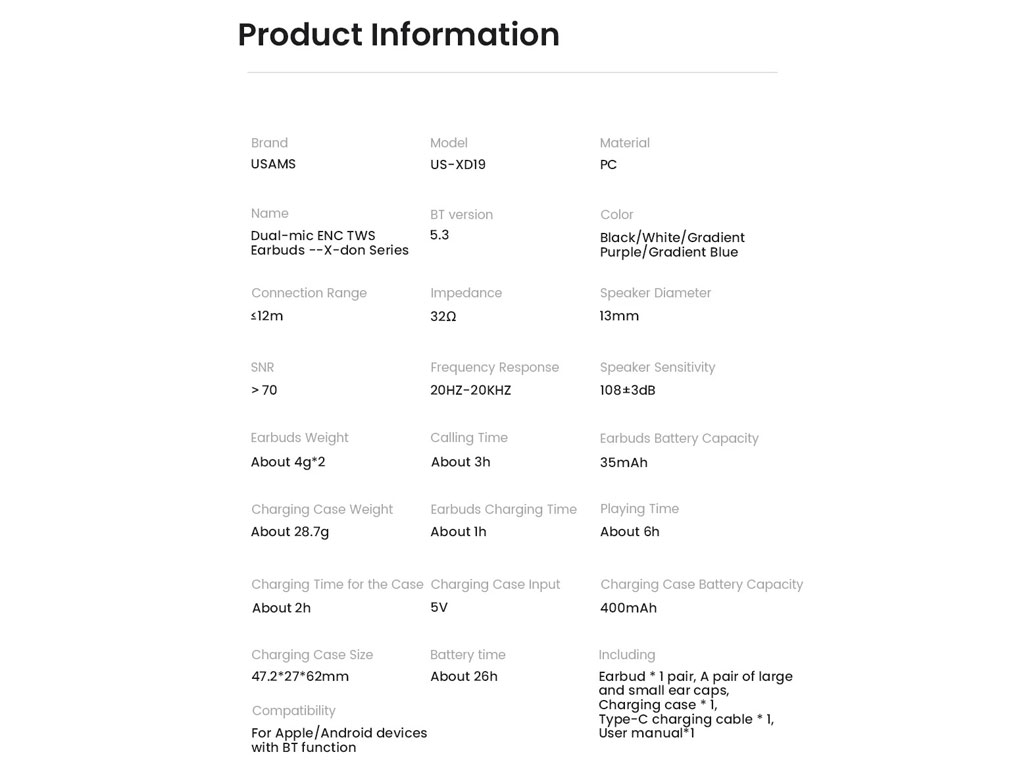 | مدت زمان شارژدهی | زمان مکالمه مداوم: حدود 3 ساعت,زمان پخش مداوم: حدود 6 ساعت,عمر باتری کیس: تقریبا 26 ساعت |