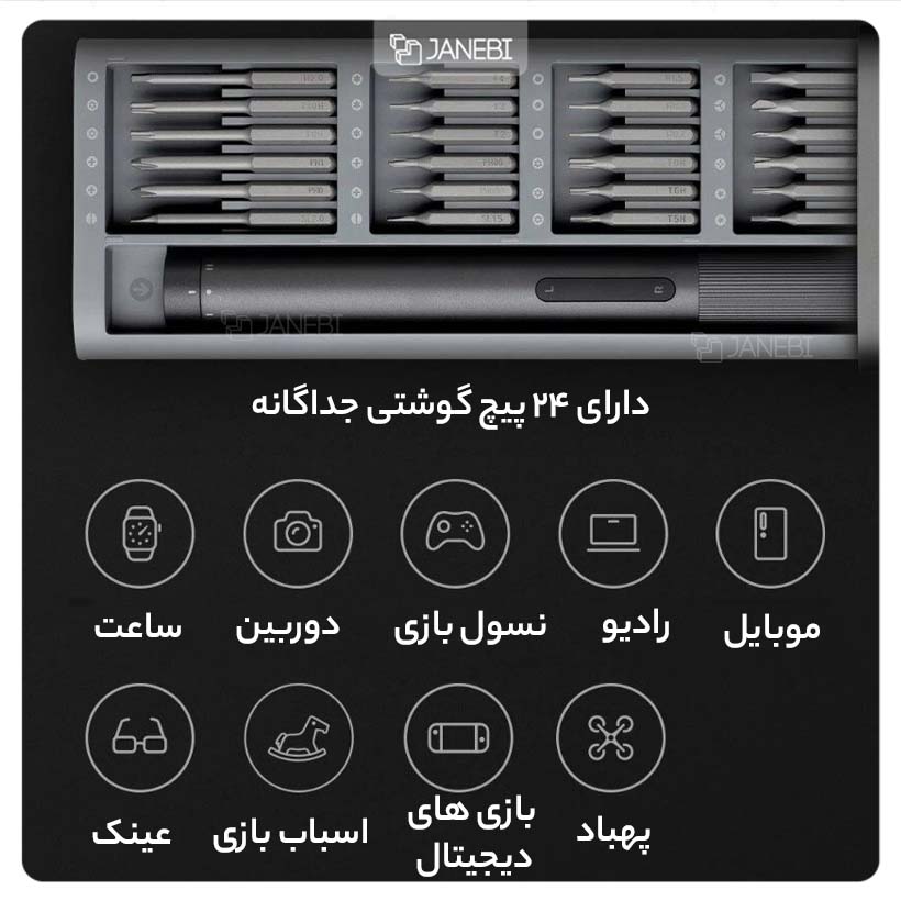 | اقلام داخل بسته | کابل شارژ USB Type-C, کیت 24 عدد سری پیچ گوشتی در شکل و سایزهای مختلف |