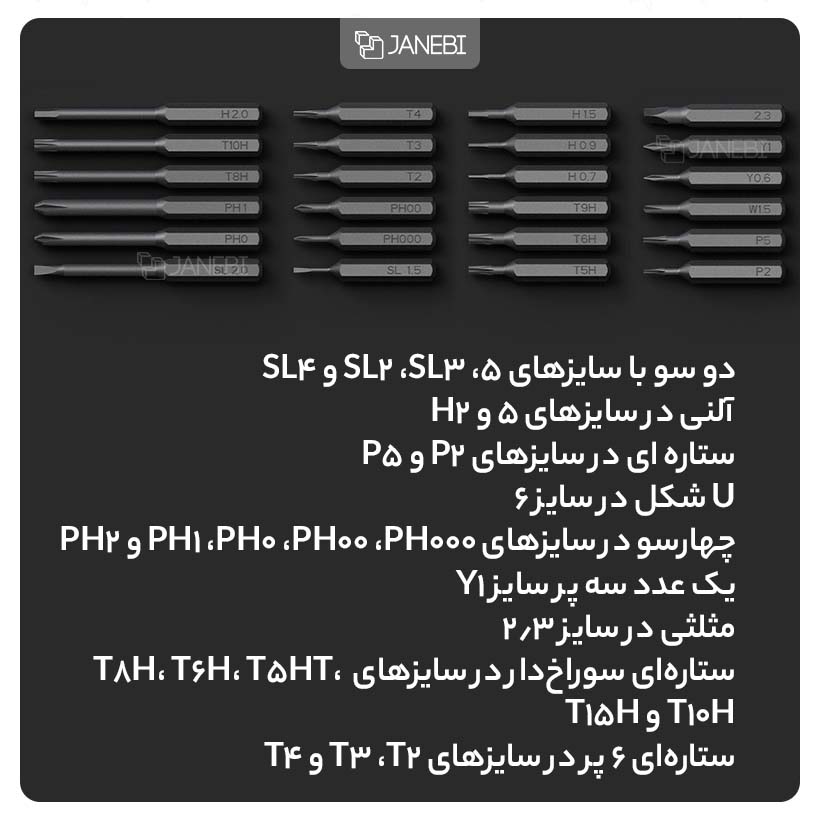 | سری ها | 1 عدد سری U شکل در سایز U2.6, 1 عدد سری مثلثی در سایز 2.3, 1 عدد سه پر در سایز Y1, 2 عدد آلنی در سایزهای H1.5 و H2, 2 عدد ستارهای در سایزهای P2 و P5, 3 عدد ستارهای 6 پر در سایزهای T2، T3 و T4, 4 عدد دوسو با سایزهای SL1.5، SL3، SL2 و SL4, 5 عدد چهارسو در سایزهای PH000، PH00، PH0، PH1 و PH2, 5 عدد ستارهای سوراخدار در سایزهای T8H، T6H، T5HT، T10H و T15H |