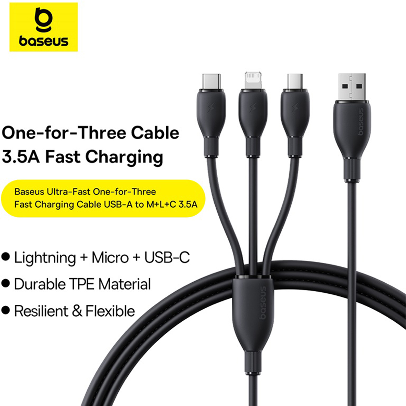 کابل شارژ USB به لایتنینگ/تایپ سی/میکرو یو اس بی طول 130 سانتیمتر 3.5 آمپر بیسوس CB000161/ P10376303121